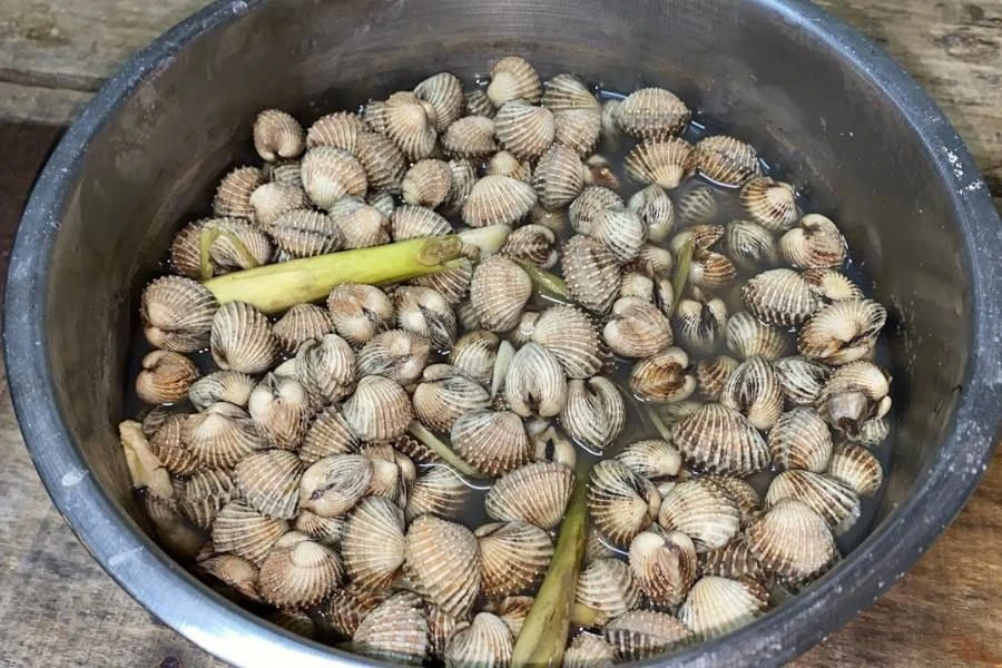 Cara paling popular adalah dengan merendam kerang dalam air bercampur garam kasar dan cili kering.