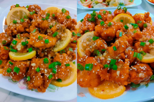 - Celupkan nugget dalam tepung serbaguna dan goreng hingga garing.