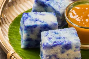 Gabungan pulut berwarna biru hasil campuran bunga telang merupakan kuih warisan peranakan Baba Nyonya.