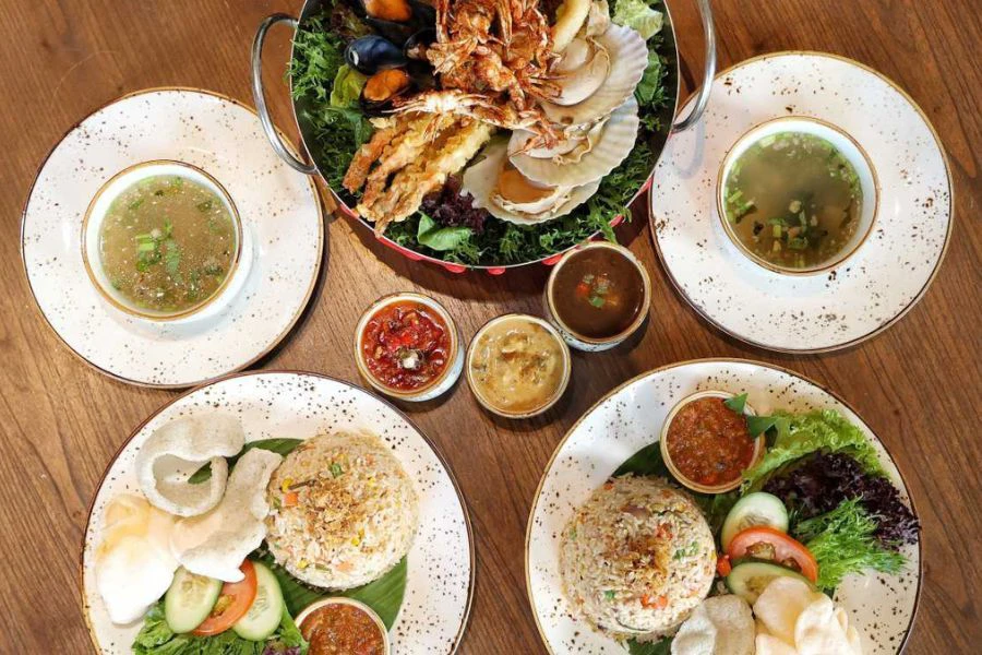 Set nasi goreng itu didatangkan bersama semangkuk makanan laut segar sarat dengan udang goreng tempura, sotong dan baby crab goreng tepung serta kupang, menjadikan sesi makan untuk dua orang bertambah menyelerakan.