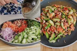- Tumiskan bawang merah, bawang putih, bawang merah, halia, cili, lengkuas, serai, serbuk kunyit dan sedikit belacan sehingga pecah minyak.