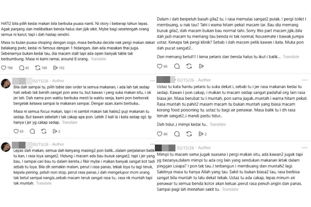 Di Threads, seorang wanita mendedahkan pengalamannya selepas berbuka puasa di sebuah gerai yang dipercayai menggunakan pelaris.