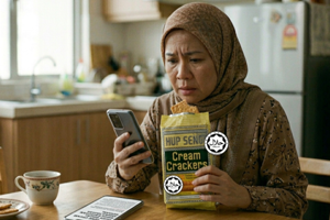Gelabah dulu, periksa info kemudian! Wanita hampir buang stok biskut sah ada sijil halal